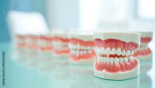 Rows of Dental Prosthetic Models with Realistic Teeth on a Light Surface