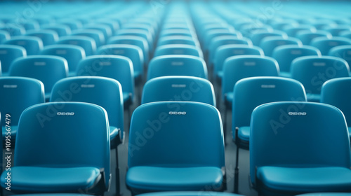 Rows of empty blue chairs in an auditorium create a symmetrical pattern, ready for an upcoming event or gathering.