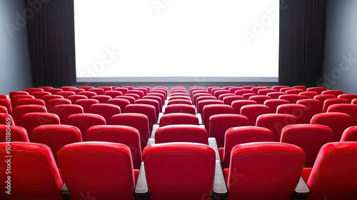 Rows of empty red theater seats facing a large blank screen, prepared for the next screening, isolated on white