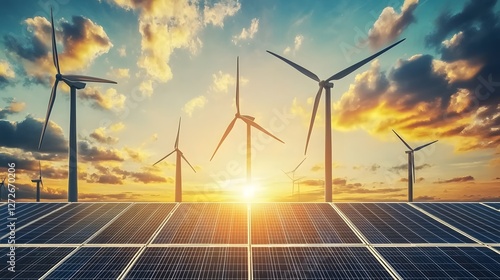 solar, panel, energy, renewable, farm, modern, technology, sunset, wind, cloud, sky, sustainable, environment, clean, electricity, landscape, horizon, power, installation, green, future, innovation, climate, sunlight, environmentally friendly, generation, alternative, efficiency, nature, beautiful, idylli, scenic, aerial, view, summer, outdoors, bright, vibrant, renewable resources, clean energy, utility, infrastructure, system, home, economy, electric