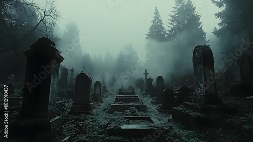foggy, cemetery, dusk, ancient, gravestone, standing, tall, gnarled, tree, mist, creeping, ground, row, old, weathered, gravestone, visible, through, thick, blanket, fog, dark, silhouette, distance, lone, crow, perched, crumbling, gravestone, cemetery, swirling, around, wing, adding, eerie, atmosphere, narrow, pathway, winding, desolate, lining, way, rolling, casting, ghostly, glow, full, moon