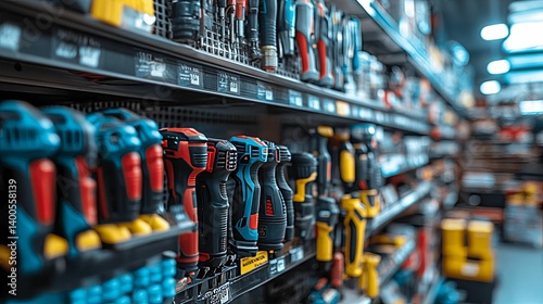 drill, screwdriver, wrench, tool, hardware, store, shelf, shop, equipment, construction, repair, maintenance, work, bricolage, electric, cordless, battery, power, energy, various, display, assortment, organisation, retail, metal, plastic, housing, safety, accessory, supply, industry, mechanic, handyman, fix, improve, build, assemble, repairing
