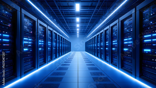 Rows of powerful server racks in a futuristic data center, glowing with vibrant blue lights for high-speed network connections.