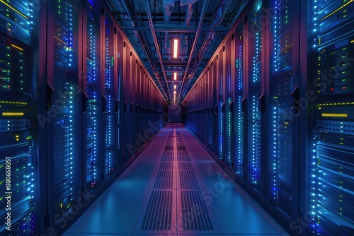 Rows of servers in a long data center hallway. Suitable for technology concepts