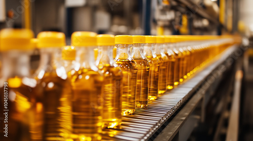Rows of sunflower oil bottles with yellow caps moving along an automated conveyor in a modern factory, illustrating the industrial packaging process