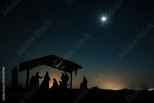 royal and stylish, A minimalist design with a subtle depiction of the Nativity scene and the star of Bethlehem in a bright color against a muted background