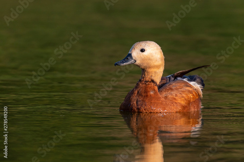 Ruddy Shelduck, single bird swims on the lake. Tadorna ferruginea