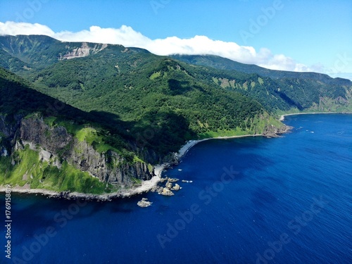 shiretoko, hokkaido, japan, peninsula, cliff, headland, escarpment, bay, cove, inlet, headland, mountain, forest, greenery, slope, vale, ridge, geology, volcanic, basalt, rock formation, boulder, reef, surf, deep blue, water, ocean, seascape, panoramic, aerial, drone, summer, daylight, clear sky, cloud, wilderness, remote, protected, unesco, national park, adventure, hiking, travel, tour tourism, nature, landscape, east asia, pacific