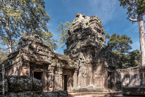 Ruins of ancient Cambodian temple among trees in Angkor complex, Siem Reap, Cambodia