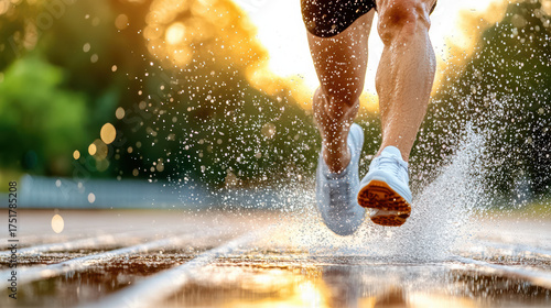 runner, sprinting, track, water, sunset, motion, athlete, sport, speed, fitness, competition, summer, exercise, athletic, training, dynamic, splash, leg, footwear, action, healthy, lifestyle, energy, determination, performance, nature, sunlight, blur, excitement
