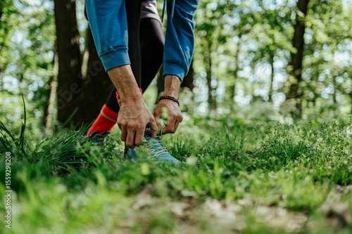 Runner tying shoelaces on trail running shoes in green forest