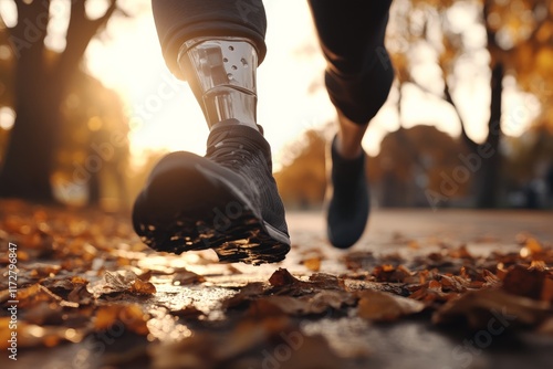 Runner with prosthetic leg enjoys autumn jog through fallen leaves in a park at sunset
