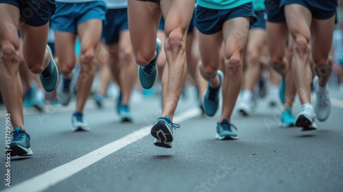 Runners in motion, showcasing athletic legs and footwear on city street during race. energy and determination are palpable