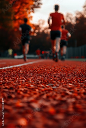 Runners sprinting on an orange track in autumn with a forest background for fitness