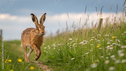 Running Hare in Wildflower Meadow Landscape Photography, Wildlife, Nature, Animal, Brown Hare Brown Hare, Wildlife Photography