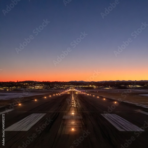 runway, dawn, sunrise, aerodrome, light, orange, horizon, sky, city, mountain, evening, landing, flying, taxiway, jet, plane, travel, transportation, terminal, illuminated, focused, perspective, long, straight, asphalt, pavement, road, marked, line, light, illumination, dot, warm, colours, calm, empty, nature, landscape, destination, flight, journey, future, sharpened, photo, view, twilight