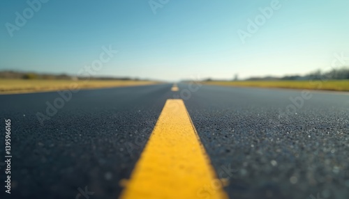 Runway leads towards blue sky sunny day. Asphalt road surface, white yellow line, perspective view, horizon, ground, travel, transportation, journey, forward, straight, open, freedom, destination,