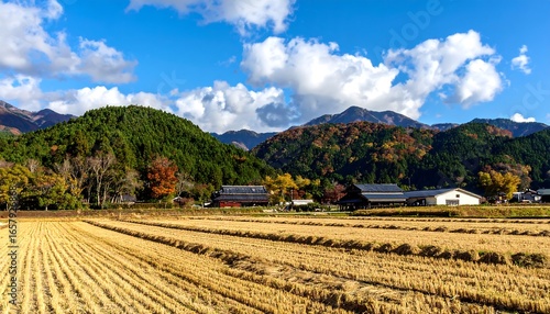 Rural Japanese Village Amidst Autumn Hills and Harvested Rice Fields.