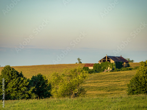 landscape, sky, field, barn, house, grass, green, nature, farm, countryside, blue, summer, meadow, sunset, agriculture, country, rural, cloud, building, view, tree, village, cloud, beautiful, home, mountain