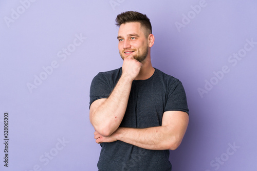 man, man, people, person, male, guy, model, portrait, studio, photogenic, youth, young, adult, russian, blond, hair, beard, background, isolated, wall, lateral, looking, head, face, look, eye, concept, side, smile, laugh, happy, happiness, smiling