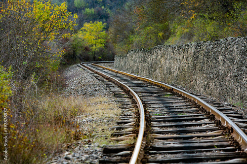 Russian Straight Railway with trees. Landscape with railroad, summer time traveling, freedom of movement.