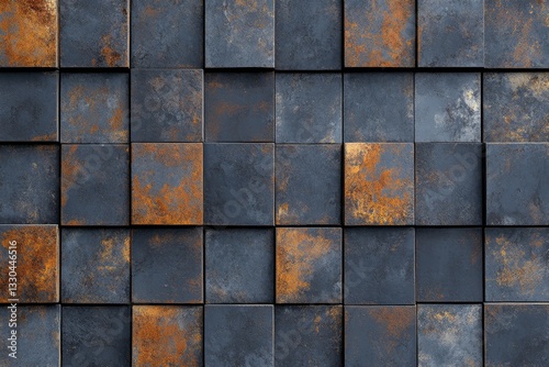 Rusted Metal Cube Wall Texture - texture of dark blue and rusty orange metal cubes, ideal for industrial or grunge backgrounds