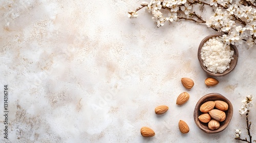 Rustic arrangement of rice and almonds beside delicate floral branches on a textured surface