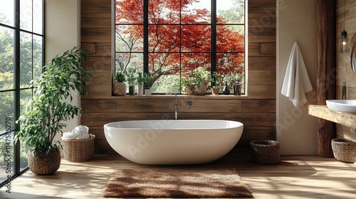 Rustic bathroom, bathtub, autumnal window view.