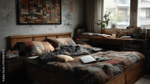 bedchamber, rustic, wooden, bed, textile, painting, abstract, art, cosy, calm, inviting, natural, light, window, book, layer, texture, vintage, home, decor, design, style, aesthetic, atmosphere, mood, comfort, warmth, pillow, blanket, quilt, brown, grey, pattern, artwork, interior, residential, furniture, market, sale, product, room, house