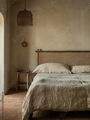 bedchamber, rustic, woven, headboard, bed, pillow, linen, blanket, lamp, hanging, light, fixture, stool, wooden, floor, tile, terracotta, wall, neutral, beige, tan, brown, texture, simple, minimal, decor, interior, design, home, furniture, room, archway, window, quiet, calming, peaceful, earthy, organic, natural, hand-made, artisan, craftsmanship, detail, close, up, nobody, indoor, daylight