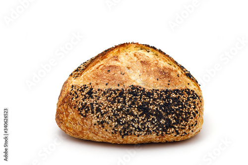 Rustic bread with white and black sesame seeds isolated on white background
