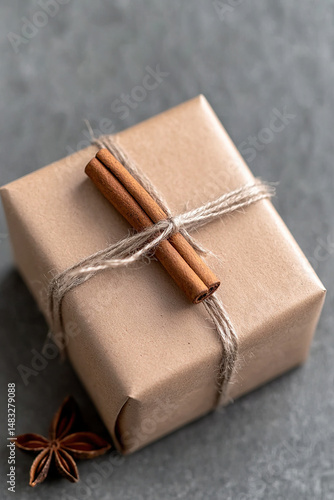 Rustic brown gift wrapped in kraft paper, tied with twine, adorned with cinnamon stick and star anise for natural touch