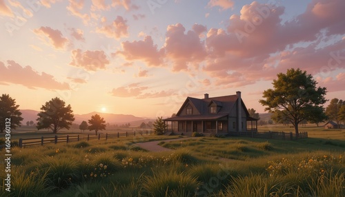 cabin, house, bungalow, rural, countryside, landscape, sunset, sunrise, gold, hours, evening, dusk, dawn, sky, cloud, pink, orange, yellow, warm, light, sunlight, nature, outdoors, scenic, beautiful, peaceful, tranquil, serene, idylli, pastoral, meadow, field, grass, tree, forest, timberland, hill, mountain, vale, path, road, fence, wooden, architecture, building, home, dwelling, rustic, charming