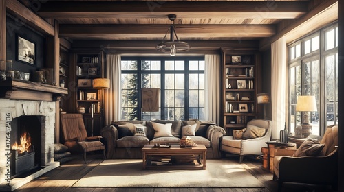 rustic, cabin, living, room, wood, fireplace, sunlight, window, sofa, chair, bookshelf, cosy, warm, inviting, tranquil, home, decor, interior, design, furniture, lighting, lamp, natural, light, comfortable, elegant, stylish, aesthetic, vintage, modern, luxury, space, property, real, estate, house, style, art, architecture