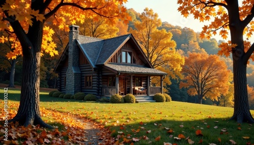 Rustic cabin surrounded by golden maple and oak trees, trees, autumn colors, lake