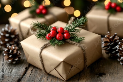 Rustic Christmas Gifts Wrapped in Kraft Paper with Pine and Holly Berries