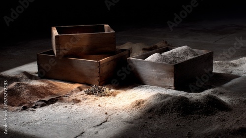 Rustic dark wooden boxes on dusty floor dramatic lighting storage concept mystery vintage interior shadow scene