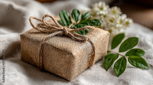 Rustic eco-friendly gift wrapped in burlap with twine and green leaves on natural fabric.