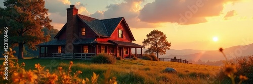 Rustic farmhouse with a red brick chimney emitting warm smoke, red, country, farm