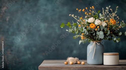 flower, bouquet, vase, ceramic, still life, rustic, teal, cream, soft focus, moody, atmospheric, serene, calm, home decor, interior design, floral arrangement, photo, image, visual, website, blog, advertisement, publication, natural, beauty, calmness, texture, background, composition, artistic, elegant, vintage, aesthetic, design, style, decor, arrangement, table, wood, container, plant, natural light, photo