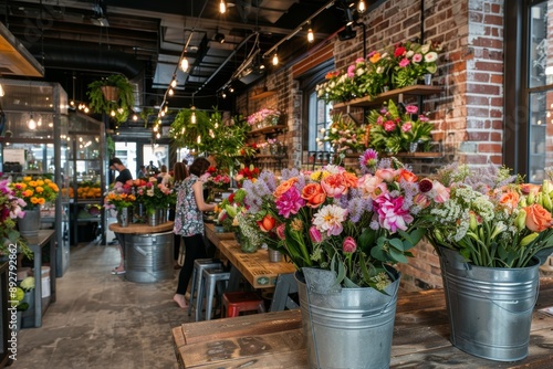 rustic, flower, shop, interior, exposed, brick, wall, wooden, table, fresh, flower, metal, bucket, florist, arranging, bouquet, client, browsing, vibrant, floral, display, lively, inviting, atmosphere, colourful, assortment, greenery, hanging, light, industrial, design, urban, workspace, decoration, market, retail, botanical, bloom, natural, charming, cosy