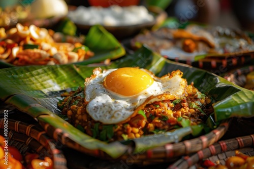 Rustic Fried Rice with Sunny-Side-Up Egg on Banana Leaf Showcasing Southeast Asian Flavors