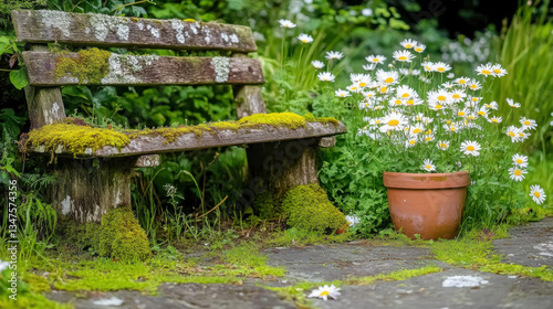 garden, corner, wooden, bench, daisy, rustic, moss, nature, plant, flower, greenery, peaceful, serene, tranquil, outdoors, natural, countryside, botanical, floral, scenic, charme, relaxation, vintage, picturesque, flora, lush, old, decoration, classic, landscape, aesthetic, environment, patio, arrangement, summer, growth, wildflower, terracotta, foliage, atmosphere, spring, bloom, seating, refreshing