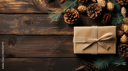 Rustic Gift Wrapped in Brown Paper with Pine Cones and Evergreen Sprigs on a Wooden Background