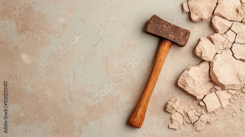 Rustic hammer on cracked concrete surface with scattered stone fragments, showcasing a construction theme in a weathered environment