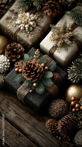 Rustic holiday gifts decorated with natural elements for a festive celebration