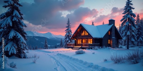 Rustic hunting lodge, deep snow, dramatic sky, peaceful, mountains, trees