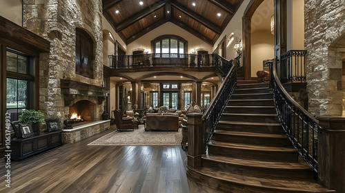 Rustic Interior Design with Wooden Staircase and Fireplace - Photo