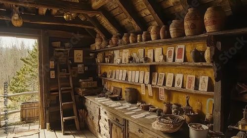cabin, shelf, jar, artifact, wood, rustic, nature, storage, decor, history, craft, interior, design, table, utensil, tool, ladder, wall, pottery, hand-made, rural, tradition, culture, environment, cosy, workspace, vintage, collection, food, herb, spice, plant, light, scenery, simplicity, warmth, craftsmanship, organisation, agriculture, heritage, landscape, calmness, exploration, creativity, community, preservation, artistry, ambience