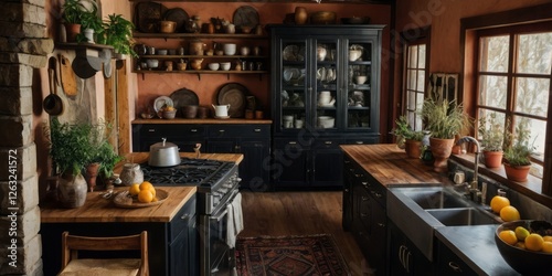 kitchen, rustic, dark, cabinet, wooden, countertop, farmhouse, vintage, antique, old, shelf, pot, pan, dish, plate, glassware, sink, faucet, stove, oven, range, hood, orange, fruit, plant, herb, greenery, window, light, wood, floor, rug, decor, style, design, home, room, cosy, warm, atmosphere, country
